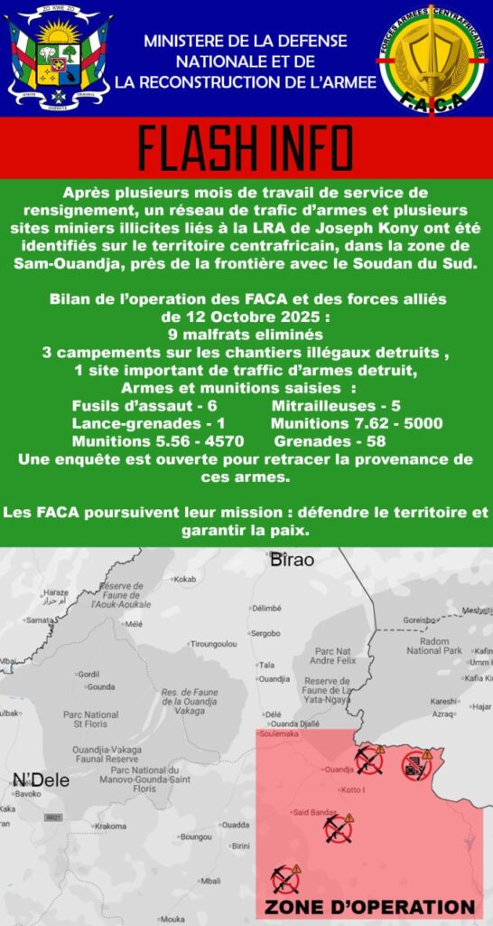 Le 12 octobre 2025, une opération conjointe dans la zone de Sam-Ouandja, a permis de neutraliser neuf (9) malfaiteurs et de saisir un important arsenal. Ces bandits armés, appartiendraient aux éléments de la LRA de Joseph Kony, selon les informations relayées par l’Etat-Major des Forces Armées Centrafricaines (FACA).